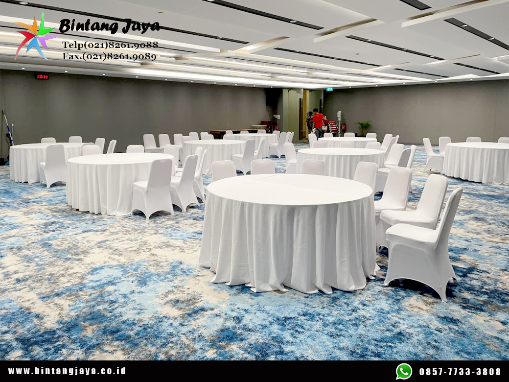 Rental Round Table Dan Meja Kotak Taplak Putih Biru Jakarta