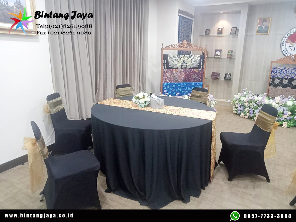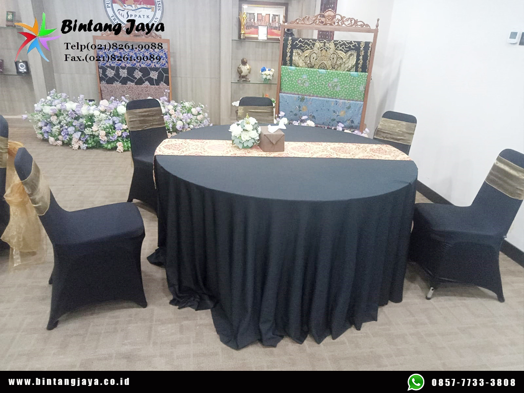 Produk Meja Bulat kami dilengkapi taplak meja berkualitas & Berkelas sehingga meja Bulat tampak bagus bersih dan mewah. Meja Bulat kami Tersedia beberapa pilihan ukuran, warna dan model taplak meja. Pilihlah taplak meja sesuai tema acara maupun selera anda agar event anda tampak cantik dan Seirama.