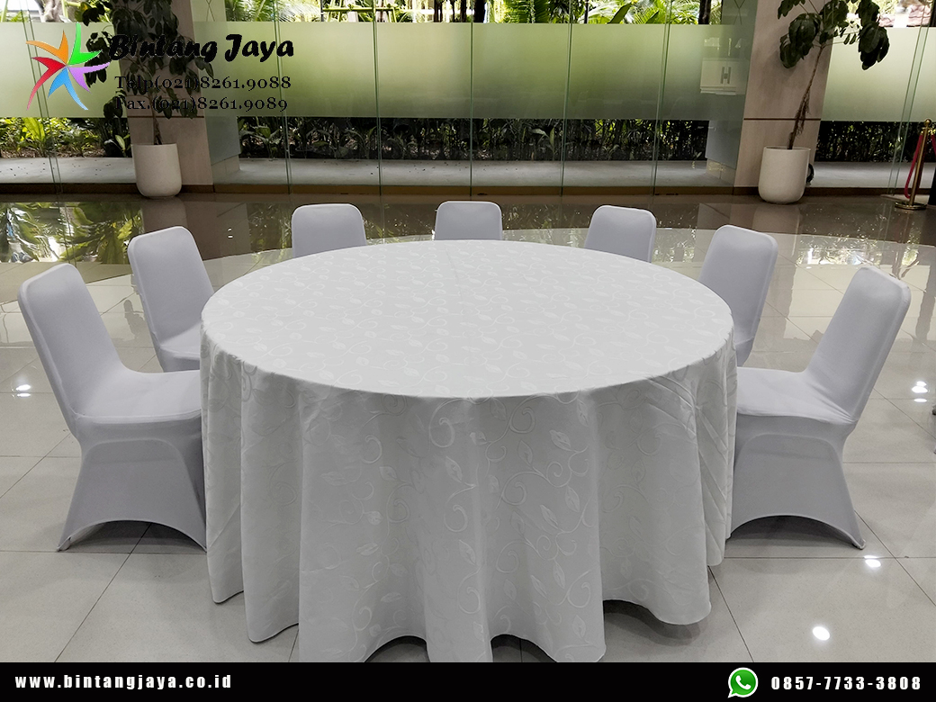 Produk Kursi Dan Meja Bulat kami dilengkapi taplak meja berkualitas & Berkelas sehingga tampak bagus bersih, cantik dan mewah.