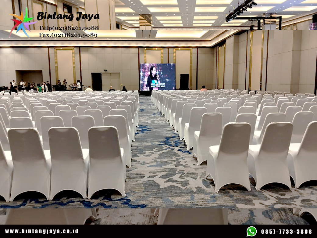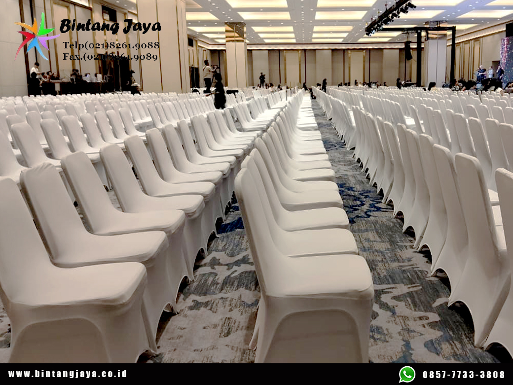 Selain itu, cover stretch putih memberikan tampilan yang lebih elegan. Warna putih juga mudah dipadukan dengan berbagai dekorasi acara sehingga terlihat lebih profesional.